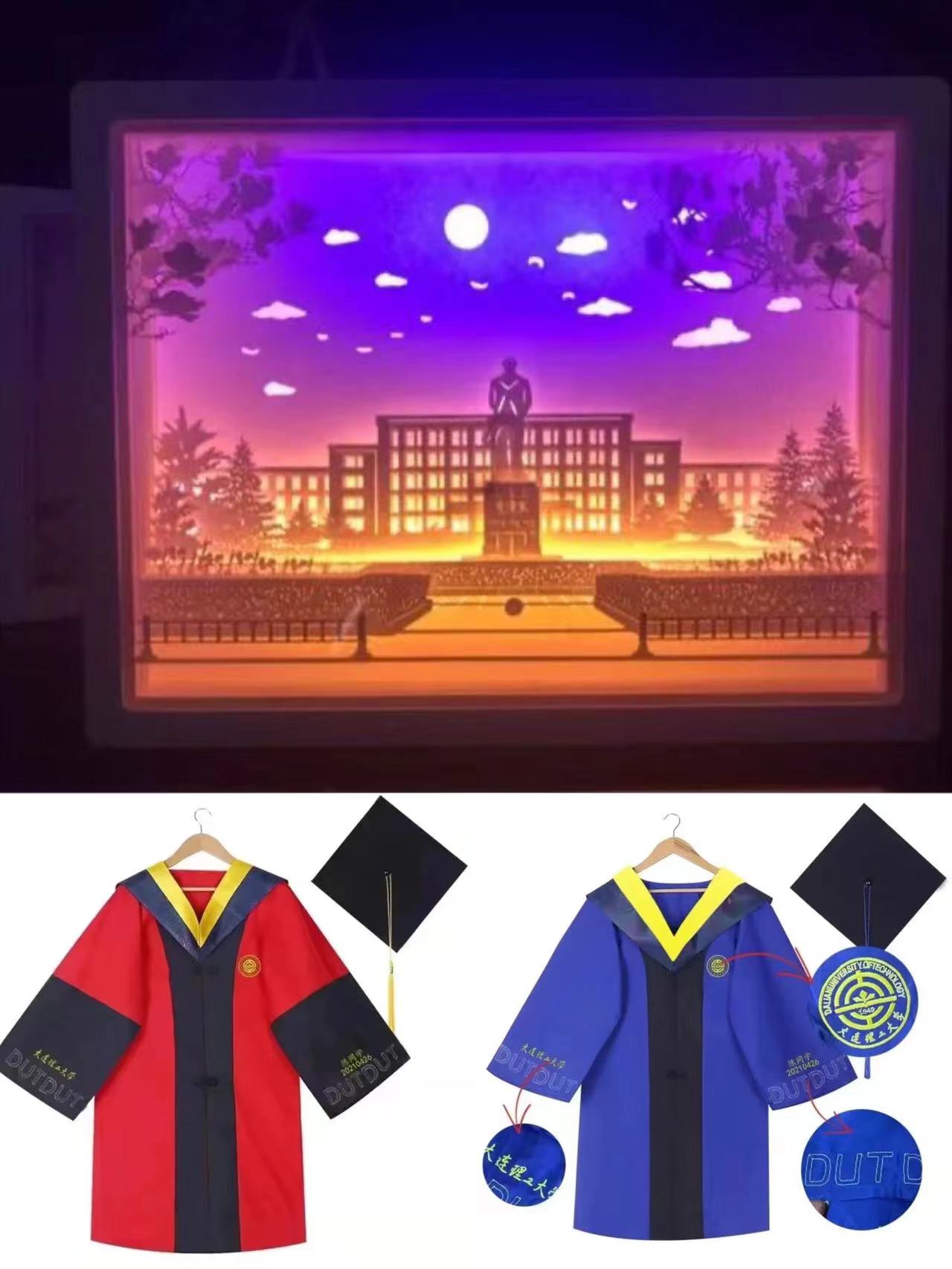 一套绣有校徽、校名、“DUT”字样以及毕业生姓名的专属学位服,