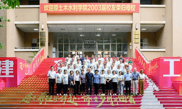 建设工程学部合照:在学部前的大台阶前上,建设工程学部部长李钢,党委副书记、副部长郭景晨,原土木水利学院副院长戴倩云,教师代表宋向群、陈廷国、刘亚坤、檀永刚、黄丽华、李静等,与所有返校的毕业生们整齐地站成行,重现了20年前的合照场景,留下了宝贵的集体回忆。