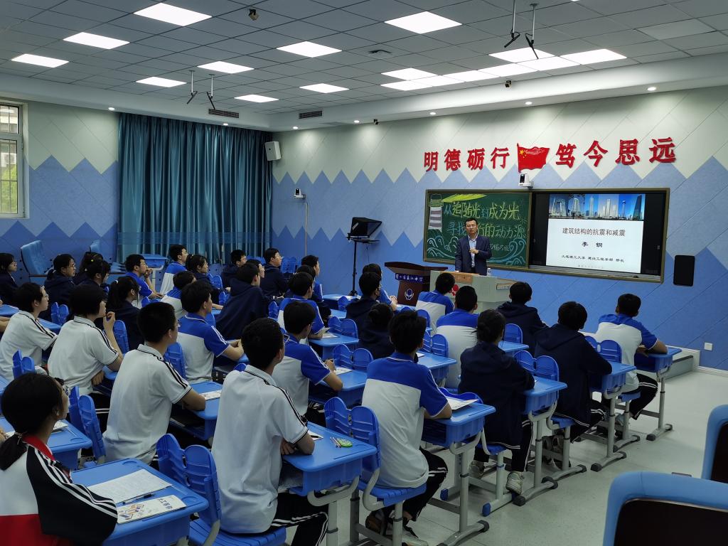 随后,李钢部长为百余名高二学生带来“建筑结构的抗震和减灾”大工讲堂,围绕日常建筑中常见的突发问题与解决方法,为高中学子们介绍了建筑结构在抗震减灾方面的相关知识,讲座内容深入浅出,进行学术科普的同时又贴近了学生们的日常生活。
