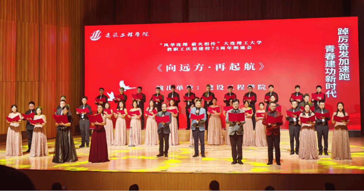 为庆祝建校75周年,校工会于5月16日举办“风华连理 薪火相传”大连理工大学教职工朗诵会。建设工程学院教职工团队以《向远方·再起航》献礼周年庆典,深情回顾了学校75年奋进的荣光,赢得了观众们的阵阵掌声,展现了全院教职工们奋斗者的精神风貌和奉献者的初心力量。
