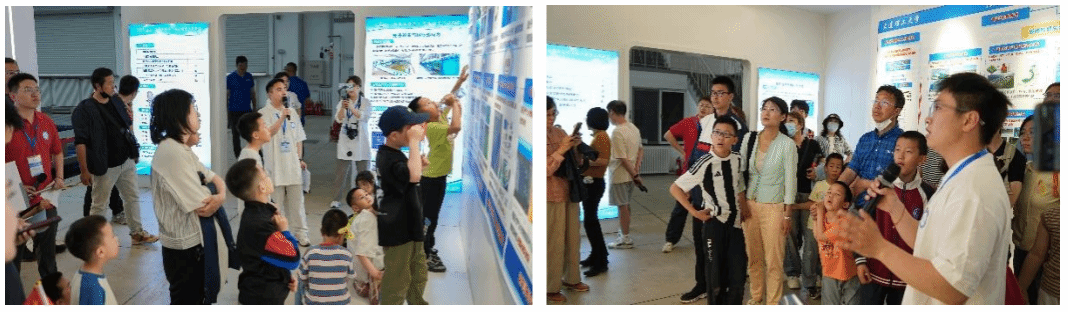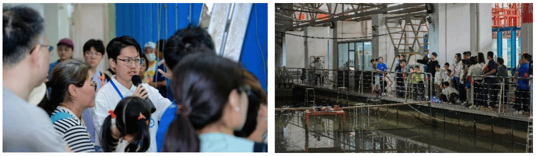 同时,实验室还在多个点位设置了讲解,包括成果展厅、多功能综合水池、O-Tube试验装置循环回路、长短周期复合造波水池、非线性波浪水槽等。6名志愿者详细介绍了实验室发展历程、代表性科研成果以及相关仪器设施,并进行了专业实验展示。