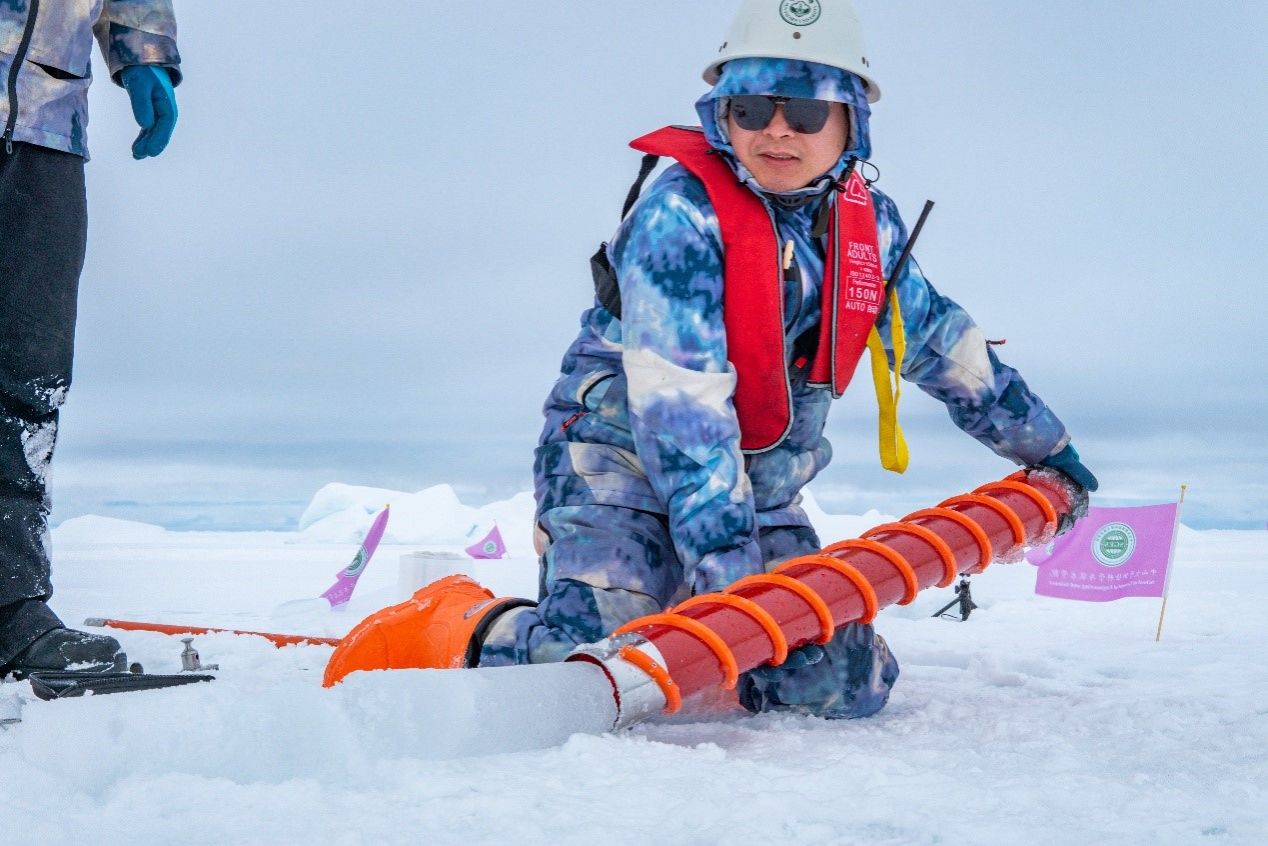 卢鹏教授在本次考察中主要负责海冰基本物理和力学性质、冰雪辐射特征等现场考察任务。在现场考察过程中,卢鹏教授克服北极恶劣的天气条件,与其他考察队员密切合作,圆满完成了各项工作,获得了大量珍贵的第一手北极海冰现场观测数据。作为冰站队队长,卢鹏教授积极协调现场作业人员、时间与任务,保证了各项海冰现场调查任务的顺利完成,被评选为本航次“先进个人”。同时,本航次也首次面向在校学生开设了冰上、船上联动直播课程,卢鹏教授结合科考任务为同学们讲解了冰站冰芯采样与观测过程。