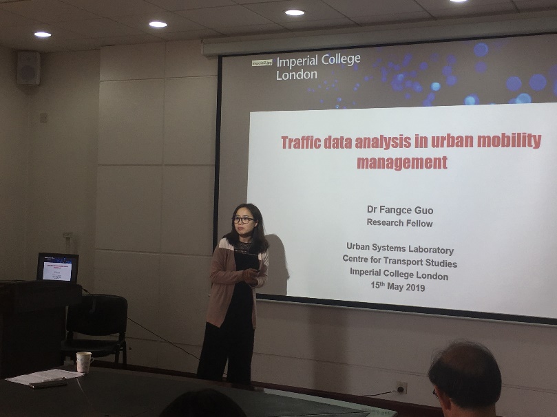 郭方策博士的讲座题为“Traffic data analysis in urban mobility management”,以大数据为驱动,结合机器学习的方法对城市短时交通需求预测进行建模,进一步开发了动态交通需求预测平台,方便对伦敦市交通运行状况进行实时监测、管理。郭博士还对未来自动驾驶与普通汽车混行的道路环境下,不同的自动驾驶汽车渗透率、不同的交通分配策略的道路通行效率进行了探讨,为无人驾驶汽车与普通汽车的路权分配问题提供最优的解决方案。