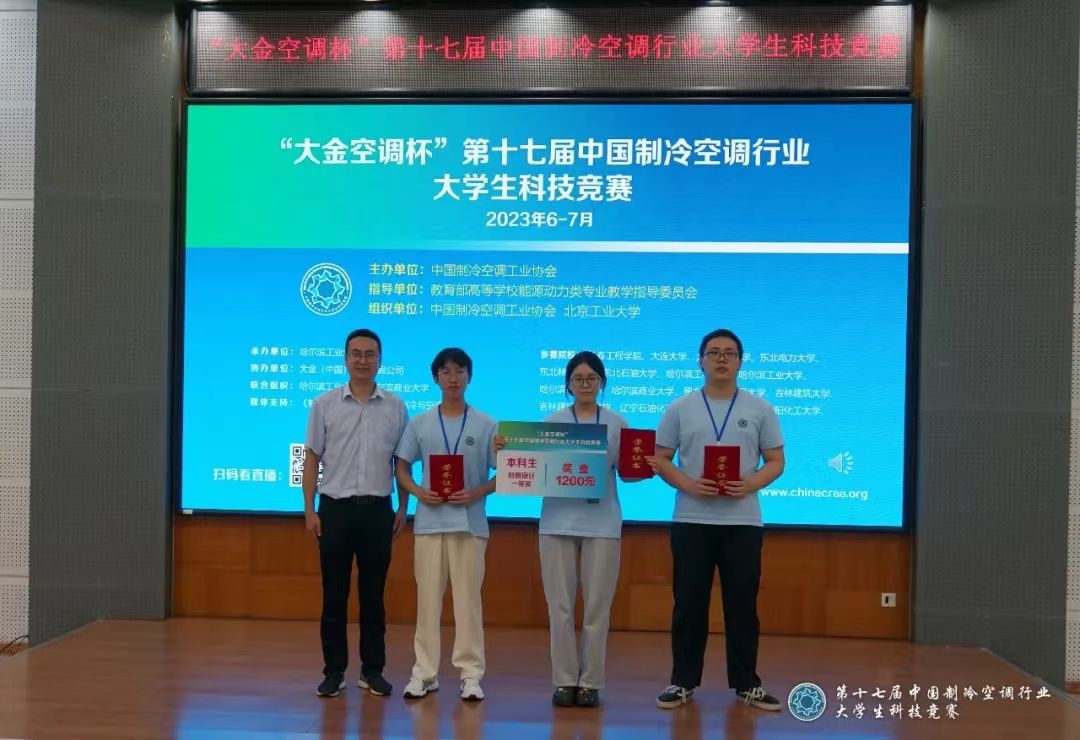 由建工学部赵金玲老师和赵宇老师指导的建筑环境与能源应用工程专业本科2020级学生司小丫、王俊皓、赵玉豪同学通过团队创新设计作品、实践操作、知识竞答三个环节的综合考验,以总分第一的成绩获得本科生组一等奖(共2项)、创新设计一等奖(单项奖仅1项),创造历年参赛最佳成绩。