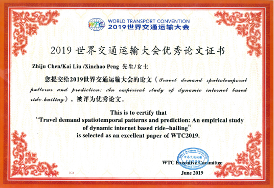 本次大会共收到2004篇论文,其中87篇被评为优秀论文。交通运输学院刘锴教授指导的博士研究生陈志举同学以及硕士研究生刘栋同学,分别于智慧城市智能交通和绿色交通系统专题论坛进行了学术报告,研究成果获得国内外相关专家、学者的支持与认可,学术论文成功入选大会优秀论文。