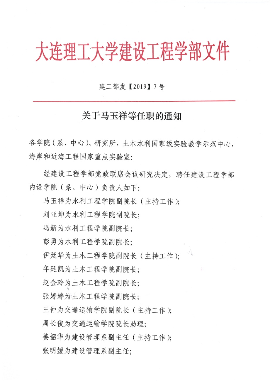 日前,马玉祥、伊廷华等受聘为建设工程学部内设学院(系、中心)负责人。经建设工程学部党政联席会议研究决定,马玉祥为水利工程学院副院长(主持工作),刘亚坤、冯新、彭勇为水利工程学院副院长;伊廷华为土木工程学院副院长(主持工作),年廷凯、赵金玲、张婷婷为土木工程学院副院长;王仲为交通运输学院副院长(主持工作),周长俊为交通运输学院院长助理;姜韶华为建设管理系副主任(主持工作),张明媛为建设管理系副主任;翟钢军(兼)、周道成、乔东生为深海工程研究中心副主任(见建工部发[2019]7号文)。