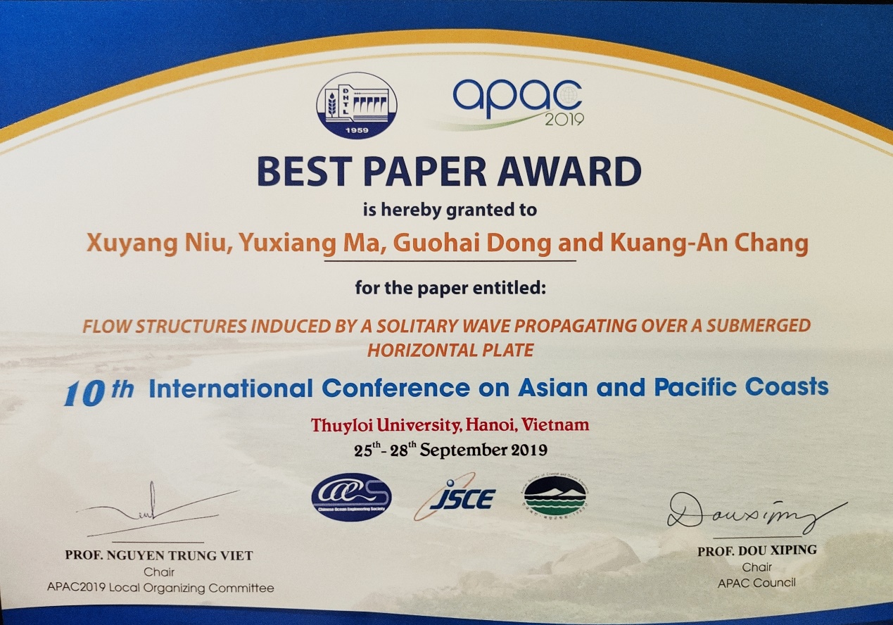 本届亚太海岸工程会议委员会从199篇收录的论文中,评选出了2篇最佳论文。由学部董国海教授和马玉祥教授指导的博士生牛旭阳的论文“FLOW STRUCTURES INDUCED BY A SOLITARY WAVE PROPAGATING OVER A SUBMERGED HORIZONTAL PLATE”经过会议专委会和组委会多轮评审,被选为该次会议的最佳论文。