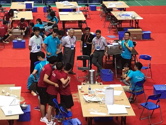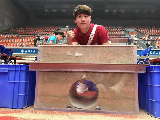 在7月18日决赛中队员们沉着冷静,发挥出色,制作的模型重量仅389.5g,全场最轻,是场上最重模型的六分之一。填装砂后,侧面看起来十分单薄,被普遍不看好。然而,当最后一片砝码加上后,最大沉降仅为3.56mm,全场仅有四个队沉降小于4mm,得到了在场专家和队员们一致赞许,最终获得一等奖。