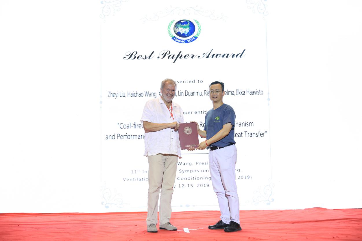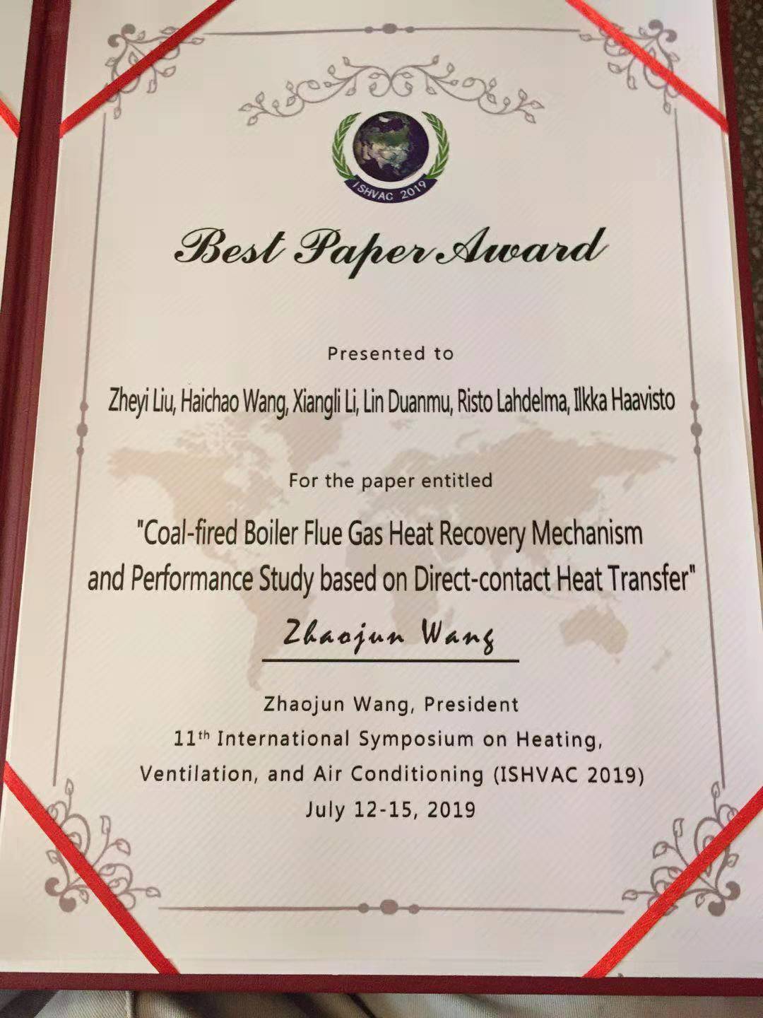 本次大会共收录国内外论文543篇,从中评选出了4篇最佳论文,颁发了ISHVAC2019最佳论文奖。由我校建工学部建环所王海超副教授和李祥立副教授联合指导的研究生刘哲毅的论文“Coal-fired Boiler Flue Gas Heat Recovery Mechanism and Performance Study based on Direct-contact Heat Transfer”获得了分会场主席的推荐,并最终经过三轮评审,脱颖而出,获得最佳论文奖,获奖率仅为0.7%,多位评委对该项工作成果给予了高度的评价。
