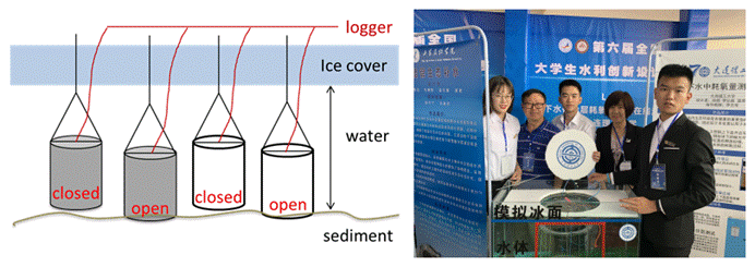 作品介绍:冰下耗氧量测试装置具有可盲视操作及人工控制上下盖开启等特点。适合用于人眼无法直接观察到的水环境进行实验,例如冰下的暗光环境;上下盖能够在装置运动时处于打开状态,在到达指定位置后释放拉绳,上下盖受到其上附加的荷载作用闭合;监测封闭在容器内水体的耗氧过程。该作品课通过黑色-透明装置(进行有无光照)对照实验,反映水下浮游生物分布;通过反映水下浮游生物分布,进行水体污染监测、治理;更换传感器,可对冰下水体多项指标进行测定。该作品具有:盲视操作、分层测试、原位对照、操作简单等创新特色。由于该装置可盲视操作,使得冰下耗氧量测定更为方便,在冬季水体结冰后可广泛应用于科研及民生领域。