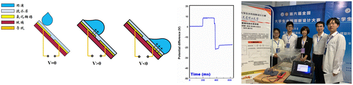 作品介绍:利用雨滴摩擦电能收集装置,可收集雨滴中的电能,即通过疏水层吸附雨滴电荷的特性,使疏水层与雨滴发生静电感应,进而在导体氧化铟锡上产生电动势。该装置可以和太阳能电池板联合使用,实现晴雨天均能发电,对大自然的能源充分利用。实际可应用于热电厂的冷凝塔冷凝水发电、城市中的玻璃幕墙雨滴发点、江河湖海水滴发点等。由于该装置具有结构简单、成本低廉、发电效率可观等特点,有着广阔的应用前景。值得一提的是,装置产生的电能有着高电压低电流的特点,电压可以达到20V,而电流仅有1.6μA,因此在自供电微流体领域有着特殊的应用。在医学、生物等领域常常要对液滴的速度进行精确控制,需要高电压,低电流来实现,该装置可以取代现有的复杂设备,直接产生满足要求的电能,大大降低了成本。雨,滋润万物,小小雨滴,未来可以成为一座能量的宝库。