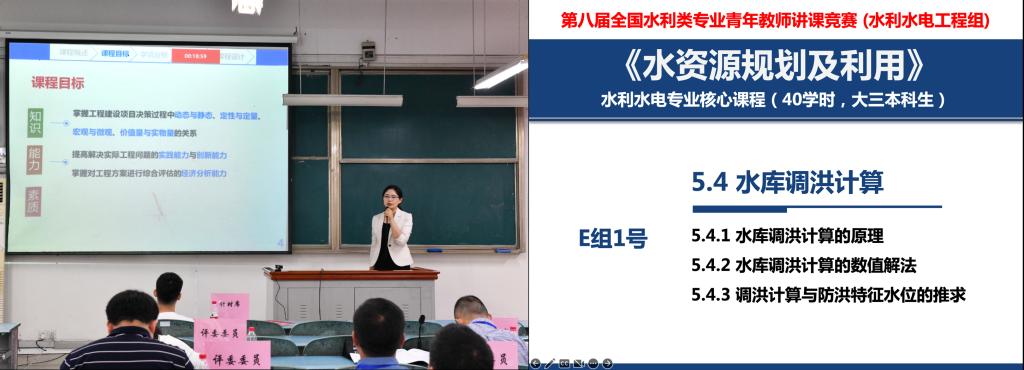 水利类专业青年教师讲课竞赛两年举行一次,在本次比赛中,我校共推荐建设工程学部姜影和李昱两位老师参赛。通过“抽签定课”,姜影老师以“内部收益率”为参赛内容,以实际土木工程典型案例为契机,采用层层递进地启发式教学方法,着重培养学生的创新思维以及解决求解复杂工程问题的能力,展示了我校青年教师的良好风范,表现突出,最终获得港航组一等奖。李昱老师以《水资源规划及利用——水库调洪计算》为参赛课程,受疫情影响未能到现场比赛,采用线上授课模式,采用数值解法替代原有的试算法和半图解法,体现了课程的“两性一度”,最终获得水工组二等奖。