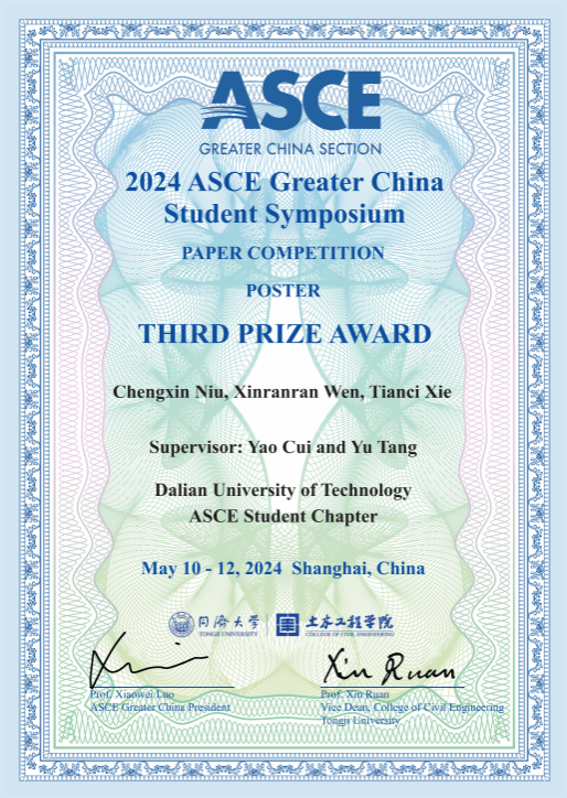 由建设工程学院崔瑶老师指导,唐玉老师、高嘉鸿领队,大连理工大学ASCE学生分会代表,土木工程(国际班)专业学生叶赟、钱诚、牛成鑫、温欣然然、纪怡佳同学与智能建造专业学生谢天赐参加比赛。我校学子在全国十四所高校代表队中脱颖而出,位列第二名,荣获二等奖!