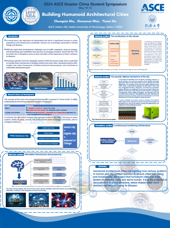 5月11日下午,在同济大学桥梁馆,各高校代表队就撰写的以构建智能与韧性的未来城市为主题的论文进行汇报答辩。我校土木工程(国际班)专业牛成鑫、温欣然然与智能建造专业谢天赐同学将智能技术类比人体健康系统,让城市在发生地震、洪水、干旱等灾害时,依赖于各系统的密切配合,可以快速进行监测、预警、决策、重新安置人员和灾后重建,为智能与韧性城市的建设提供新思路。最终取得论文比赛第二名,荣获二等奖!