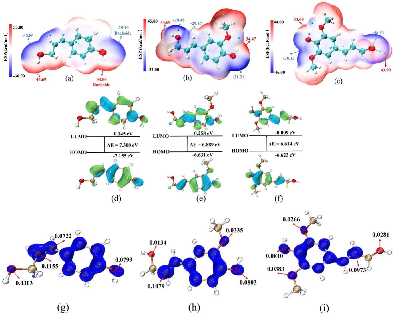 图2 木质素单体的静电势分布 (a-c)、前线分子轨道分布 (d-f)、简缩福井函数分布 (g-i)