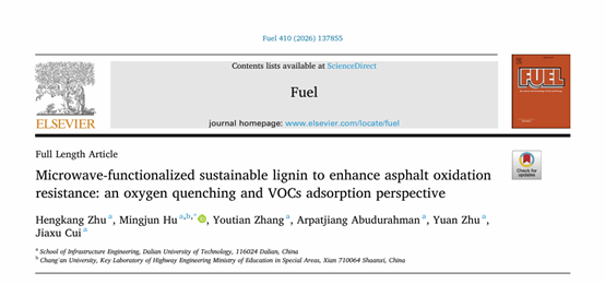 近日,学院交通工程专业2022级本科生朱恒康在胡明君副教授的指导下,以第一作者身份在能源与燃料领域期刊《Fuel》(JCR一区,影响因子7.5)发表学术论文“Microwave-functionalized sustainable lignin to enhance asphalt oxidation resistance: an oxygen quenching and VOCs adsorption perspective”。论文作者还包括交通工程专业2022级本科生张又天、朱原,以及2023级本科生艾日帕提江·阿不都热合曼。
